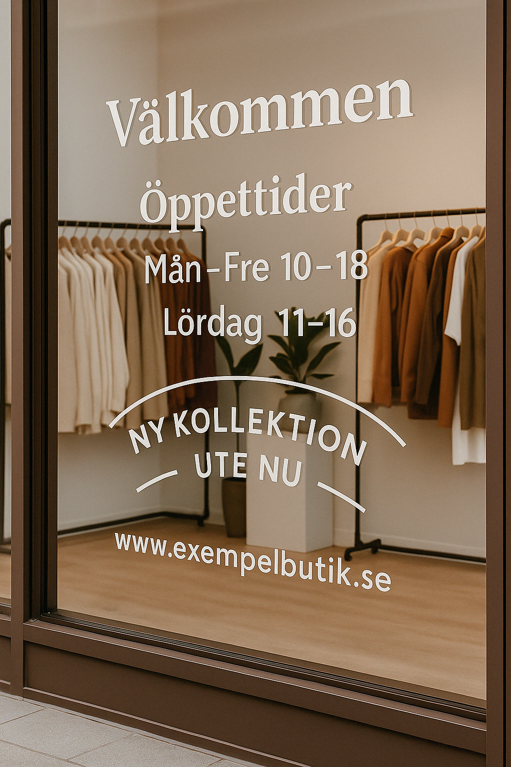 Vi producerar skräddarsydd butiksdekor för allt från fönster och väggar till golv och displayer. Oavsett om du behöver utskuren vinyl med öppettider, frostat insynsskydd, tryckta kampanjer eller funktionella dekaler – vi tar fram rätt lösning för din butik, mottagning eller kontor.